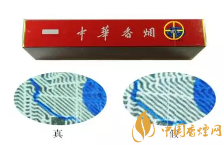 “中華”原產(chǎn)地標(biāo)志為藍(lán)色橢圓形,折光可見“中華”字樣、8顆“★”及天安門圖案。真煙色彩飽滿,圖案清晰;假煙色彩暗淡,圖案模糊。同時(shí)還可以借助圖中藍(lán)色線的走勢來區(qū)分真假煙。