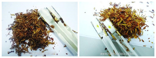 真品濾棒中添加了“香潤(rùn)珠”,油潤(rùn)性好切絲均勻,顏色呈現(xiàn)金黃色;假煙濾棒未添加“香潤(rùn)珠”,煙絲干直切絲粗細(xì)不一,顏色呈現(xiàn)出淺褐色,與真品存在顯著差異。
