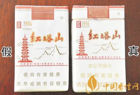 假煙采用膠印印刷,兩種顏色交界邊緣無鋸齒痕跡,“1956”字體筆畫粗細(xì)不均勻、無立體感且相對較細(xì),紅塔圖案模糊。