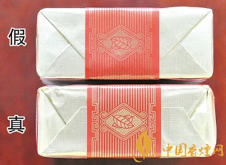 真煙透明紙燙封收縮均勻、自然,有烙鐵痕跡,商標(biāo)紙拐角折疊空隙較大;