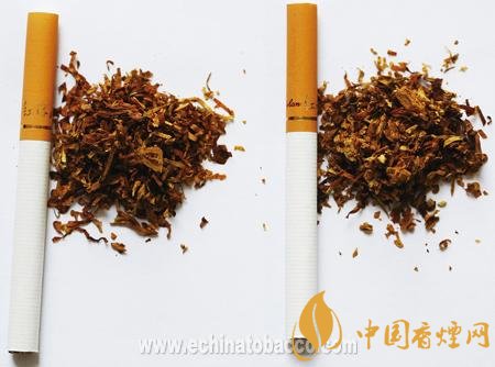 煙支過(guò)濾嘴及煙絲差異對(duì)比:真煙煙支采用單一醋纖濾嘴,長(zhǎng)度為24mm,煙絲切絲寬度均勻,煙絲疏松、光澤油潤(rùn)性好、呈檸檬黃色,煙絲結(jié)構(gòu)為葉絲、膨脹梗絲和造紙法再造煙葉;假煙煙支過(guò)濾嘴較短,長(zhǎng)度約為20mm,制絲工藝粗糙,色澤發(fā)暗無(wú)光澤、煙絲中含碎末較多,大量梗絲未經(jīng)過(guò)膨脹處理,無(wú)造紙法再造煙葉,與真品特征存在明顯差異。