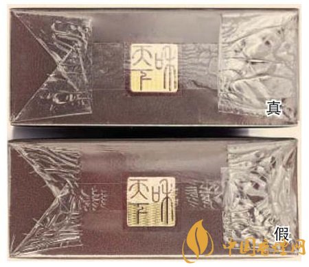 真煙商標(biāo)紙采用復(fù)合鐳射銀卡紙,膠印和絲網(wǎng)印刷,“和天下”字體采用壓凸?fàn)C金工藝,用手摸凹凸感較明顯,且字體筆畫較粗,商標(biāo)紙上字體、拼音、花紋看上去有較清晰的豎線;假煙一般為高清掃描仿制印刷,“和天下”字體用手摸凹凸感不明顯,且字體筆畫較細(xì),商標(biāo)紙上拼音、花紋等處豎線較模糊。