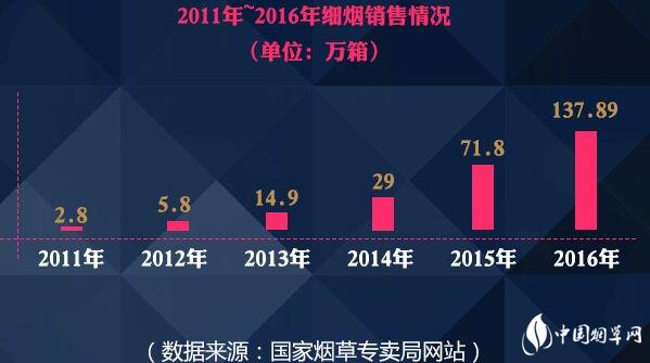 據(jù)調(diào)查顯示2014年是細支煙產(chǎn)品突然爆發(fā)的一個關鍵時間點。從這一年開始,細支煙的品牌和規(guī)格,都開始呈現(xiàn)大幅上漲的趨勢。