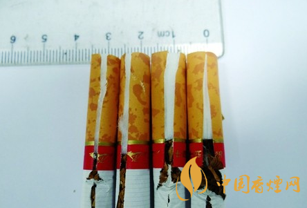 煙支濾棒長(zhǎng)度差異比對(duì):撕開(kāi)接裝紙,真品煙支濾嘴棒長(zhǎng)度大于2.5cm,濾嘴棒長(zhǎng)度超出接裝紙金線圈部分;若不撕破接裝紙判斷時(shí),可用手輕捏濾棒長(zhǎng)度是否與接裝紙紅色“奔狼”圖案平齊;假煙濾嘴棒長(zhǎng)度小于2.5cm,不撕破接裝紙判斷時(shí),用手輕捏濾棒長(zhǎng)度只到接裝紙金線圈處,與真品煙濾嘴棒長(zhǎng)度差異明顯。